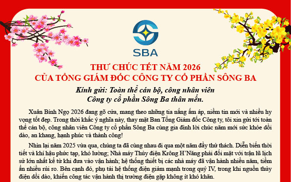 Năm mới đã tới thật gần, tôi cầu chúc cho Ban lãnh đạo và toàn thể CBCNV CTCP thủy điện Sông Ba và gia đình sức khỏe dồi dào, phúc lộc đầy nhà. Chúc cho đại gia đình Công ty Thủy điện Sông Ba một năm mới An Khang Thịnh Vượng.