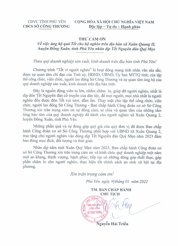 Thư cảm ơn của Công đoàn Sở Công Thương tỉnh Phú Yên