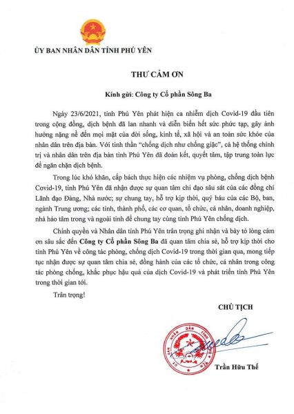 Thư cảm ơn của Ủy ban nhân dân tỉnh Phú Yên