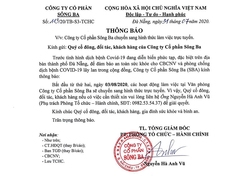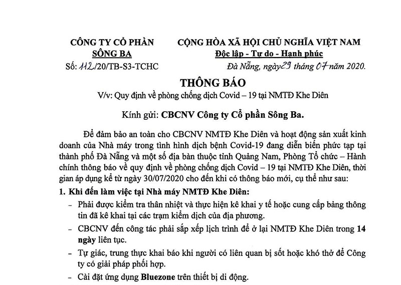 Trước tình hình dịch bệnh Covid-19 đang diễn biến phức tạp, đặc biệt trên địa bàn thành phố Đà Nẵng, để đảm bảo an toàn sức khỏe cho CBCNV và phòng chống dịch bệnh Covid-19 lây lan trong cộng đồng, Công ty Cổ phần Sông Ba (SBA) kính thông báo: