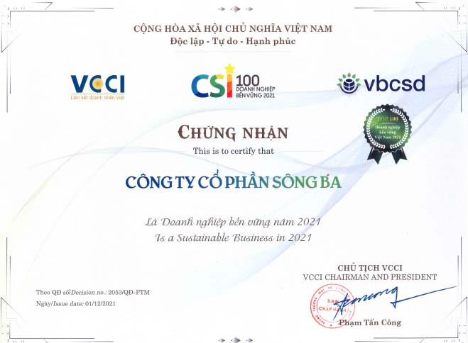 Ngày 09/12/2021, tại Hà Nội, Phòng Thương mại và Công nghiệp Việt Nam (VCCI) phối hợp với Hội đồng doanh nghiệp vì sự phát triển bền vững (VBCSD) đã tổ chức trao giải thưởng “100 doanh nghiệp phát triển bền vững tại Việt Nam”.