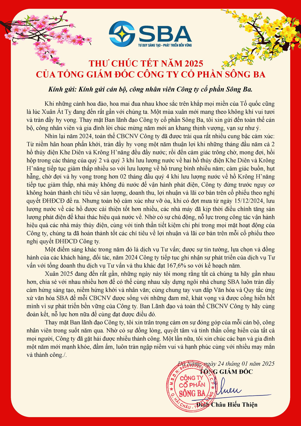 Khi những cành hoa đào, hoa mai đua nhau khoe sắc trên khắp mọi miền của Tổ quốc cũng là lúc Xuân Ất Tỵ đang đến rất gần với chúng ta. Một mùa xuân mới mang theo không khí vui tươi và tràn đầy hy vọng. Thay mặt Ban lãnh đạo Công ty cổ phần Sông Ba, tôi xin gửi đến toàn thể cán bộ, công nhân viên và gia đình lời chúc mừng năm mới an khang thịnh vượng, vạn sự như ý.
