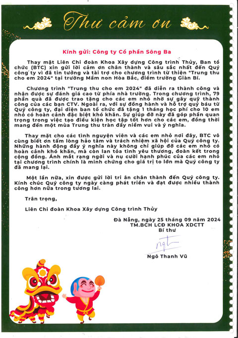 Thay mặt Liên Chi đoàn Khoa Xây dựng Công trình Thủy, Ban tổ chức (BTC) xin gửi lời cảm ơn chân thành và sâu sắc nhất đến Quý công ty vì đã tin tưởng và tài trợ cho chương trình từ thiện "Trung thu cho em 2024" tại trường Mầm non Hòa Bắc, điểm trường Giàn Bí.